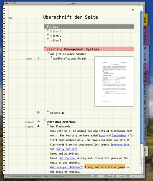 Notebook benutzt dagegen einen völlig anderen Ansatz. Es ist nicht in erster Linie dafür gedacht, um Daten abzulegen, sondern um mit ihnen zu arbeiten. Daher ahmt die Grundstruktur des Programms ein Notizbuch nach: mit Seiten, farbigen Reitern auf der Seite, Trennblättern, Inhaltsverzeichnis und Index. Diese Metapher funktioniert für mich hervorragend. Inzwischen habe ich für jeden größeren Arbeitsbereich ein eigenes Notizbuch, darin gibt es Abschnitte, die mit „Trennblättern“ abgetrennt sind und verschiedene „Seiten“ zusammen fassen, die thematisch verwandt sind. Auf den Seiten selbst kann man Text schreiben, Dateien und Grafiken ablegen, Audiodateien speichern (und abspielen) etc.