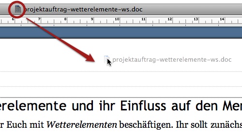 In einem typischen Dateifenster, z.B. in Word, steht oben in der Titelleiste der Dateiname und davor ein Datei-Icon. Dieses Icon kann man mit der Maus „greifen“ und damit die Datei selbst bewegen. (Das funktioniert übrigens nur, wenn die Datei seit dem Speichern nicht mehr verändert wurde.)