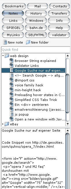 In Opera wurde dieses Tool erheblich erweitert. Meine Sidebar (in Opera heißt sie “Hotlist”) enthält insgesamt 15 (in Worten: fünfzehn) verschiedene Anwendungen — alle schön übersichtlich angeordnet und ruck-zuck zugänglich (siehe Screenshot).